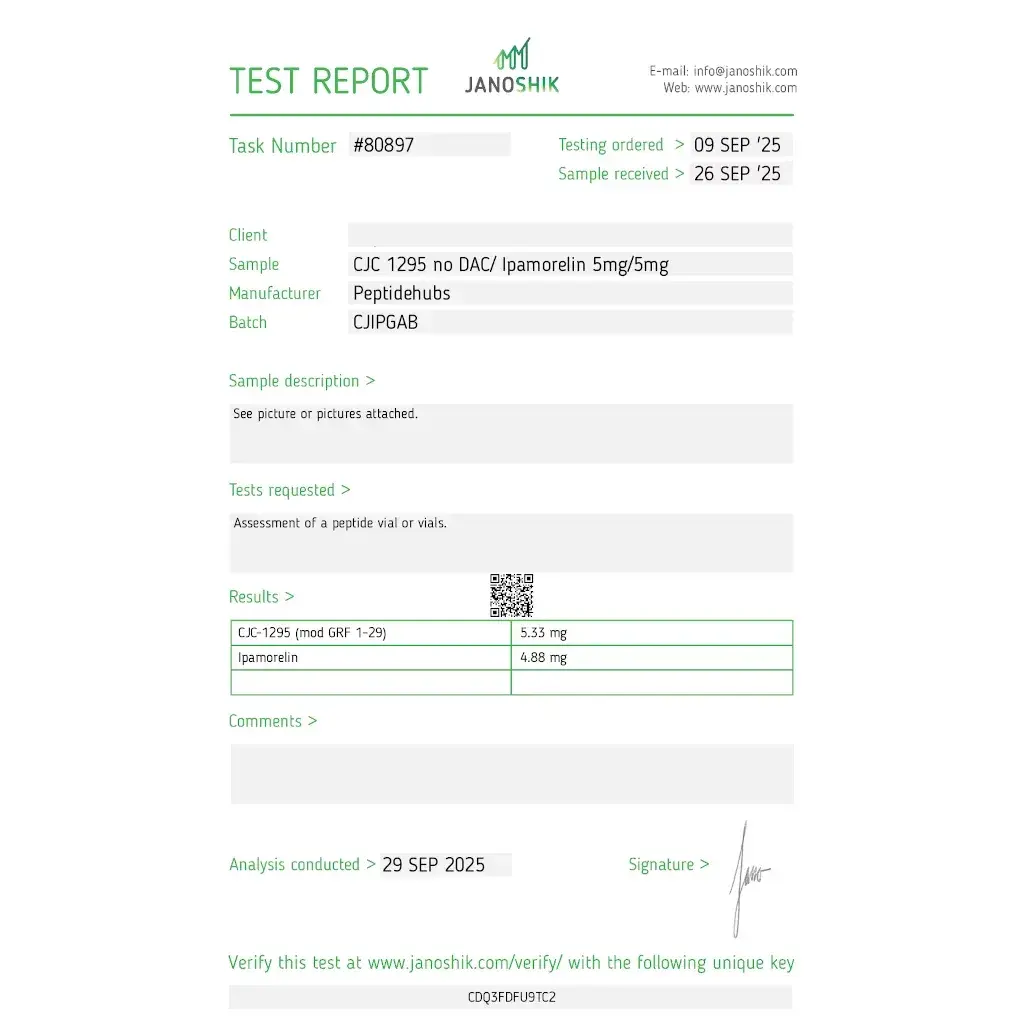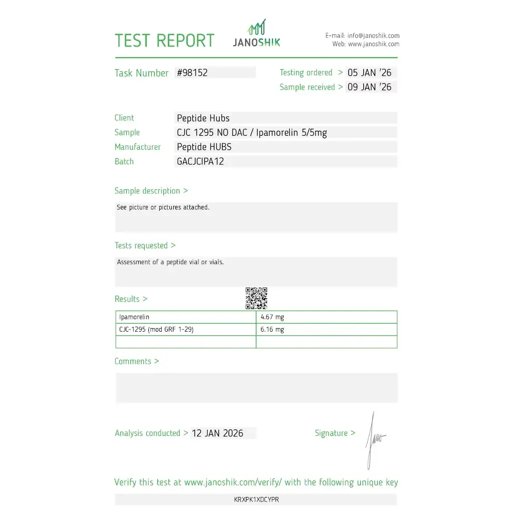 Our CJC-1295/Ipamorelin combination undergoes rigorous third-party testing to ensure purity, potency, and sterility. Each batch is manufactured in ISO-certified facilities using pharmaceutical-grade ingredients and advanced lyophilization technology. The result is a premium peptide product that delivers consistent, measurable results for serious athletes.