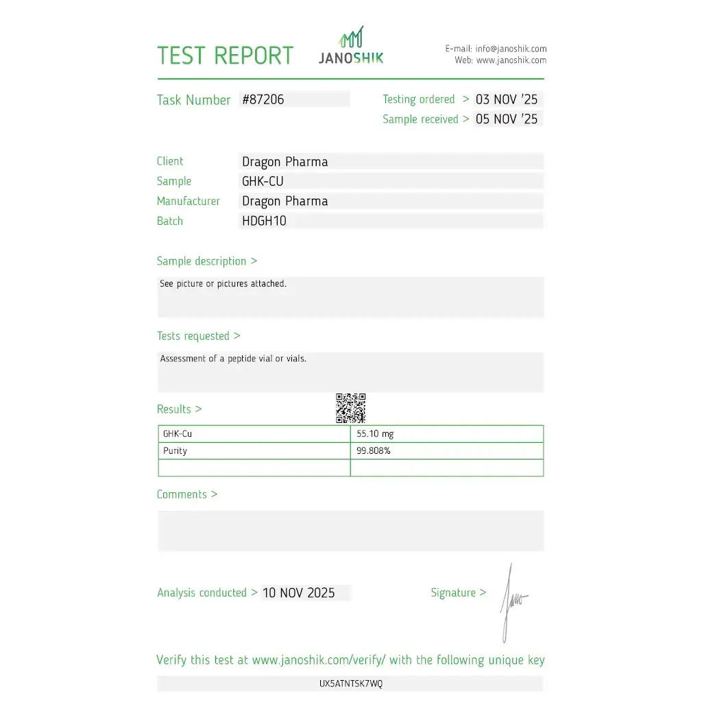 All testing was done on sealed vials, and none of these tests were performed by customers. Our goal is to maintain transparency and provide consistent verification for every new batch entering the Dragon Pharma supply chain.